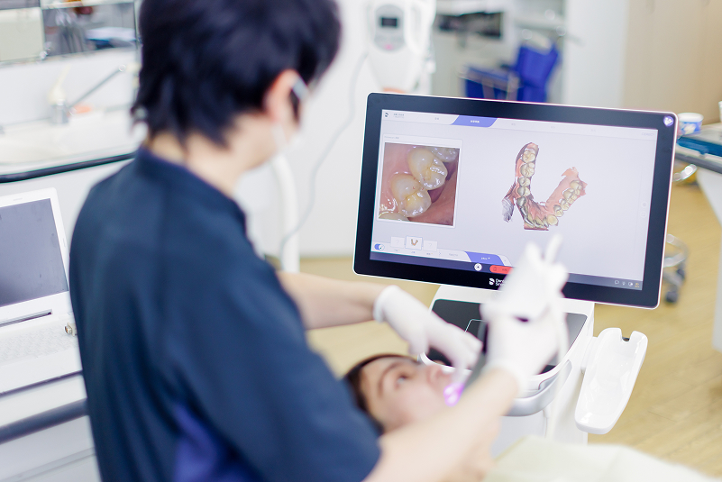 むし歯を削り、3D光学カメラでお口の中をスキャンします。従来のような粘土状の印象材による型取りと比べて不快感が少なく、数分程度で患部の様子をモニター上に再現できます。